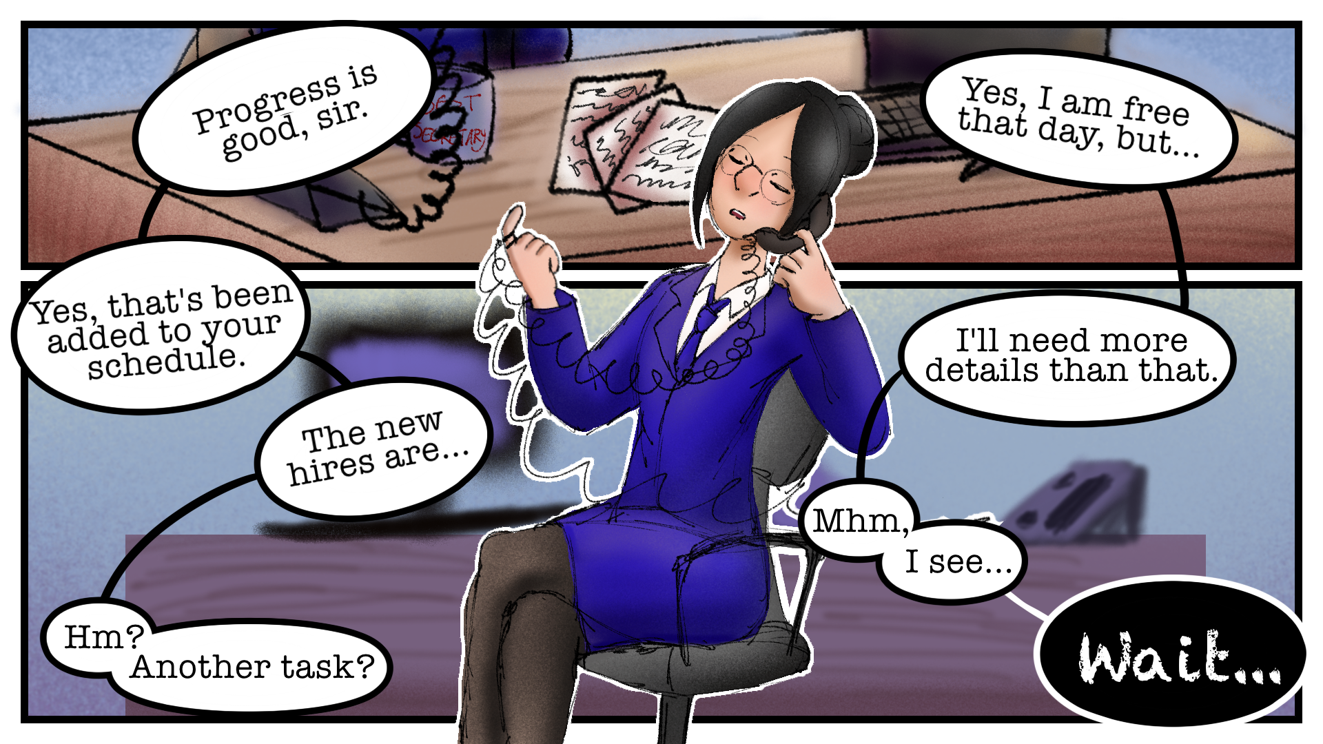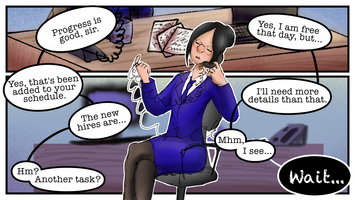 instead, i ended up redoing the story to be lighter and funnier. instead, the secretary has to deal with a hopeless guy and a sweet girl and their inability to admit their affection for each other despite already being engaged. in the first draft, the hopeless guy was more of a tsundere who sounded harsh but cared... a little too much. like saying there's no need for them to waste so much time prepping for their wedding (because they're practically married already), fighting a guy for bumping into her, and trying to get too many rings for her. in that draft, he was aware of the secretary tailing him and asked her for advice getting things a girl would like, but in the final comic, it's a bit ambiguous whether or not he knows his brother sent her